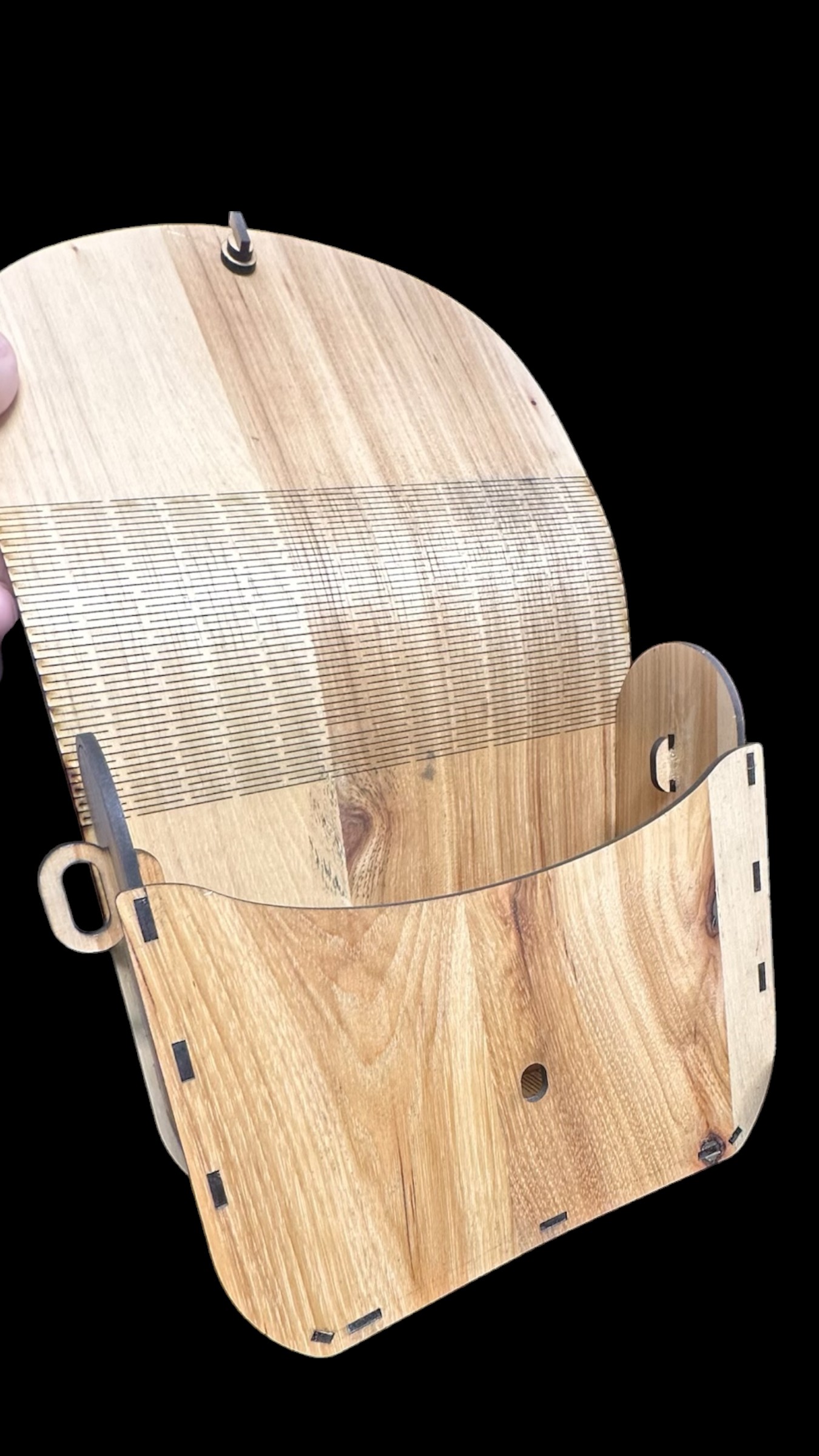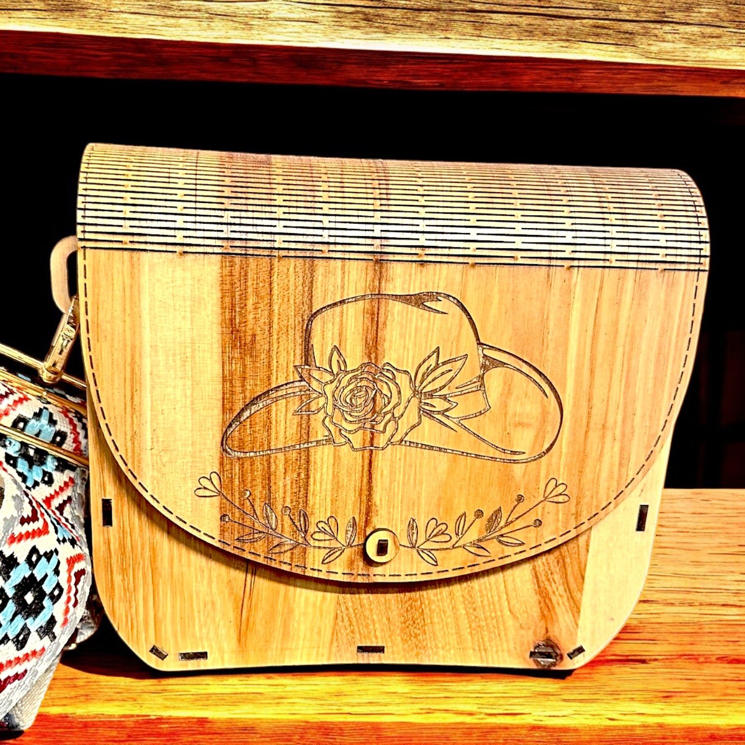 Each piece that makes up the purse is cut to size on a laser machine. Slats are cut into portions of the wood to create unique flexibility allowing the opening flap to bend as needed in a smooth fashion. Some include designs that have been laser engraved into the wood Once all pieces are done, it is then crafted and glued together for the final product.