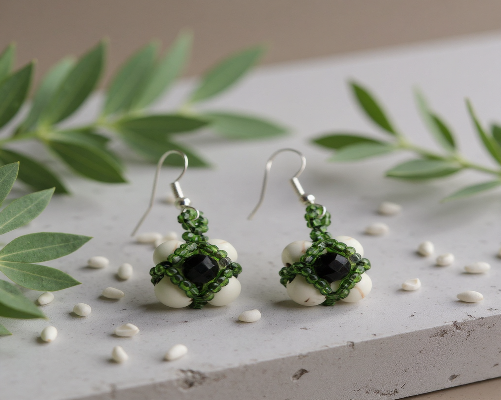 Bring a touch of natural elegance to your style with these Woodland Charm earrings. Handcrafted with a striking combination of deep forest green seed beads, creamy white accent beads, and a faceted black glass centerpiece, each earring captures the beauty of nature in a bold yet versatile design. The delicate beaded frame surrounds the central bead like a flower in bloom, creating a look that’s both timeless and modern. Lightweight and comfortable to wear, these earrings are perfect for adding a sophisticated pop of color to everyday outfits or dressing up for special occasions.
