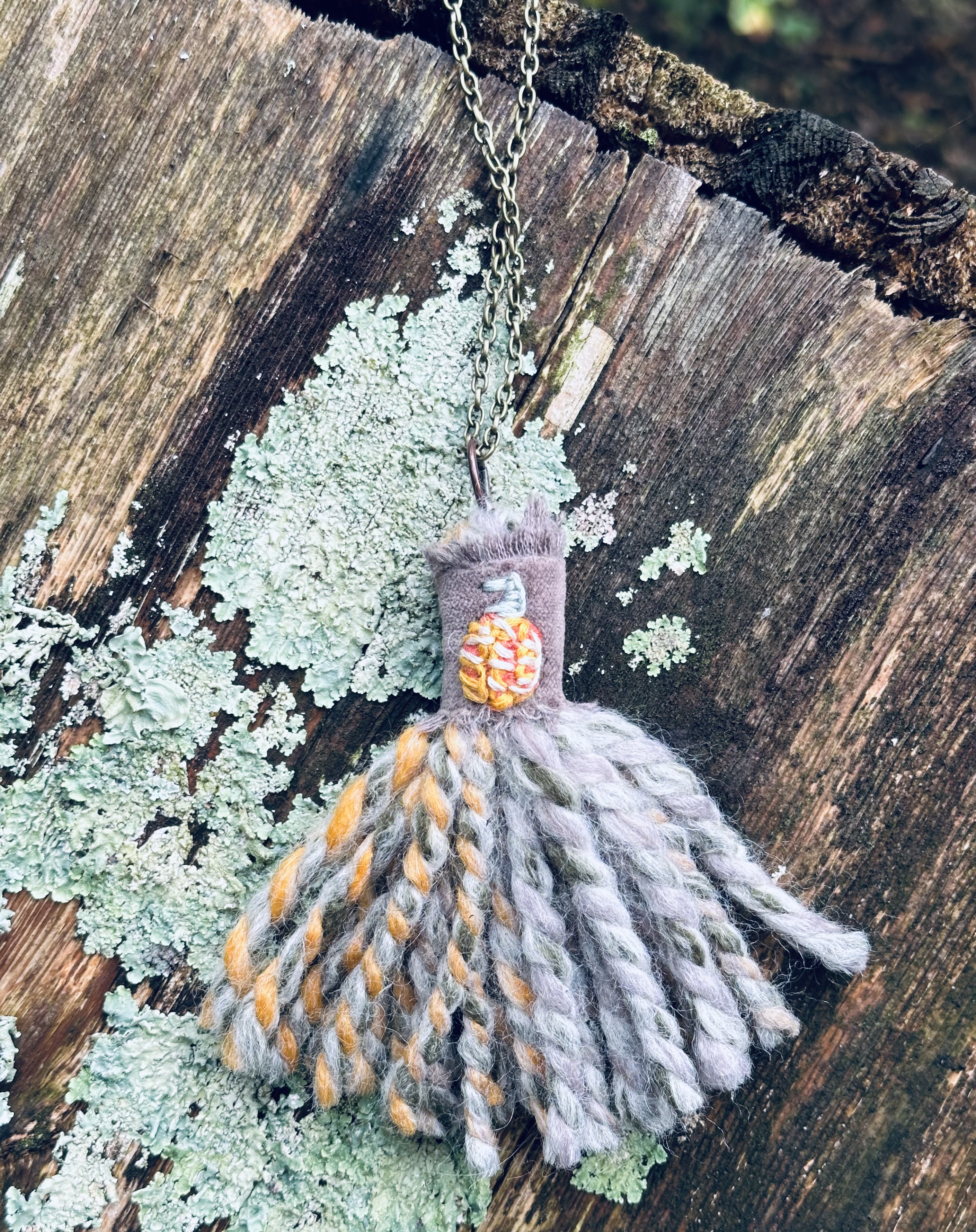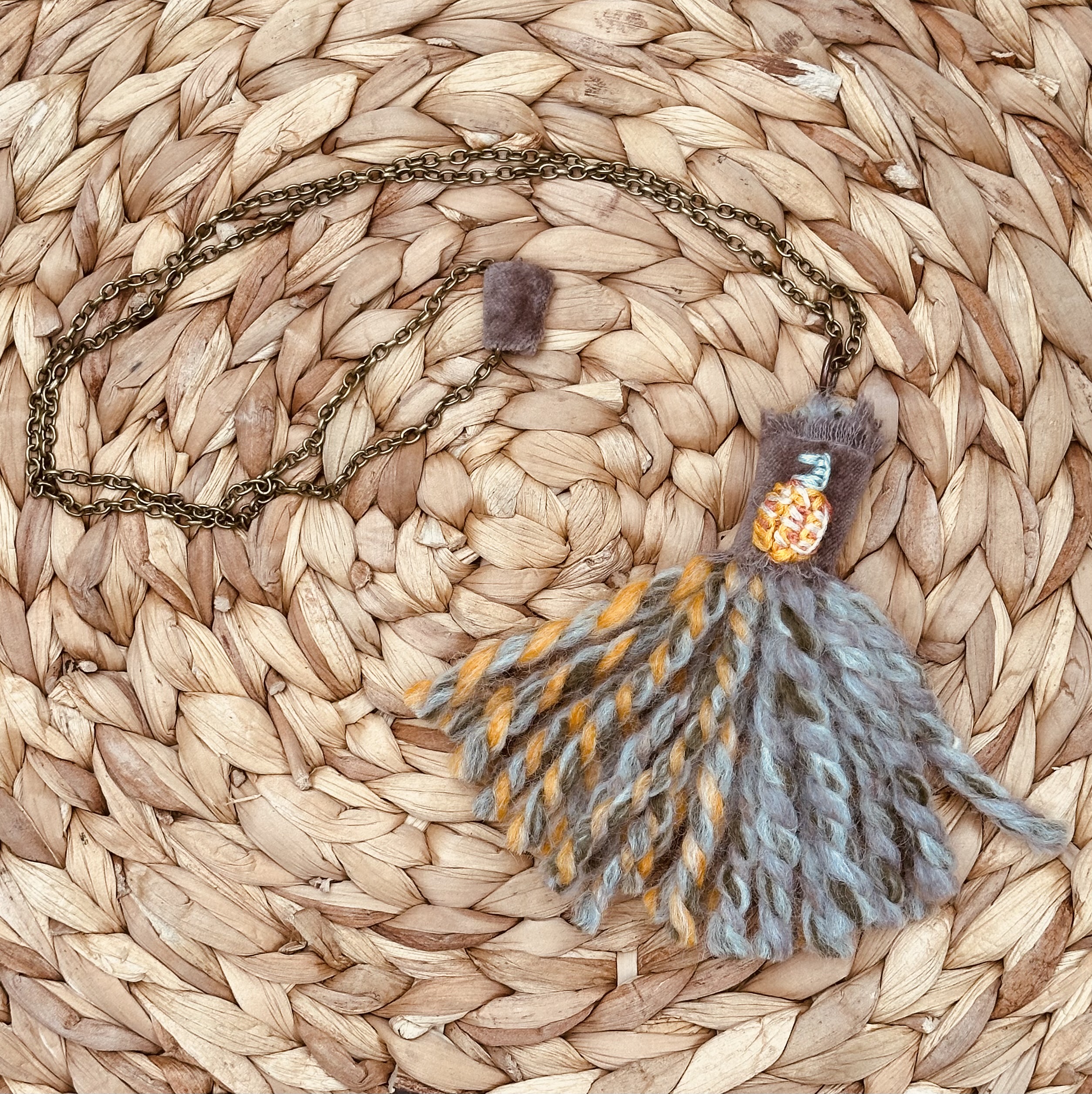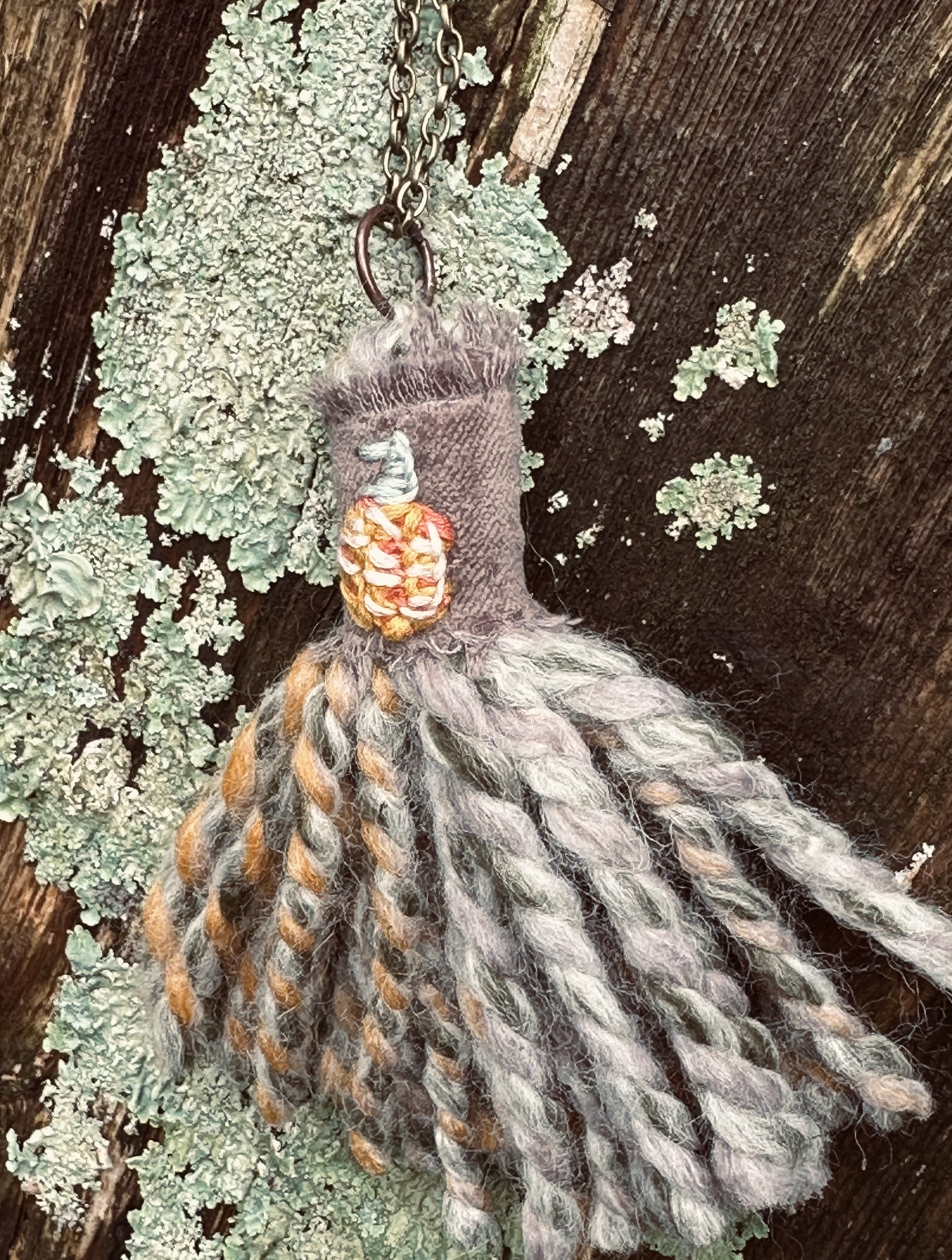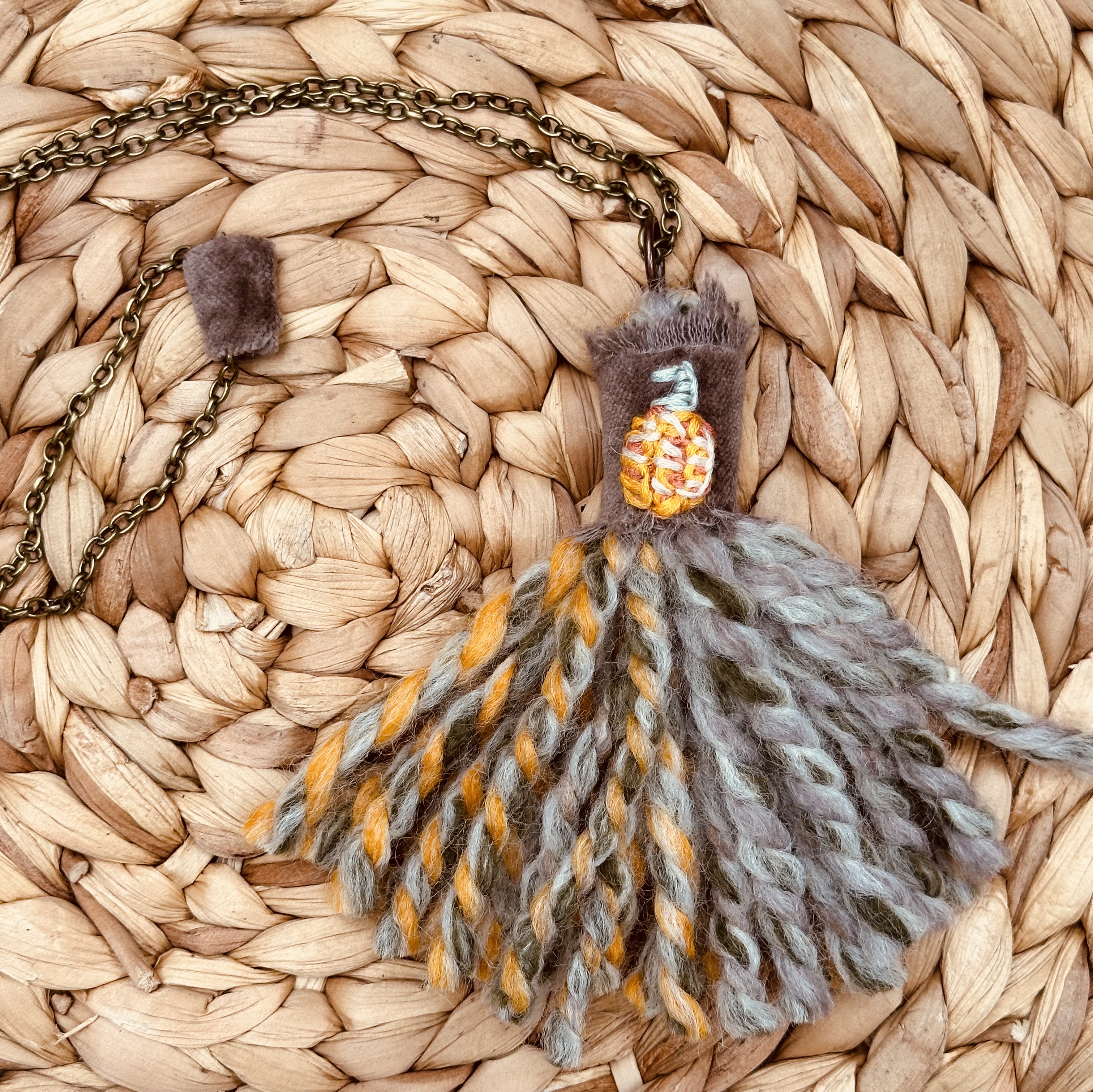 This Wool and Velvet tassel pendant has a hand embroidered pumpkin, a brass chain, and funky fashion flair for fall!