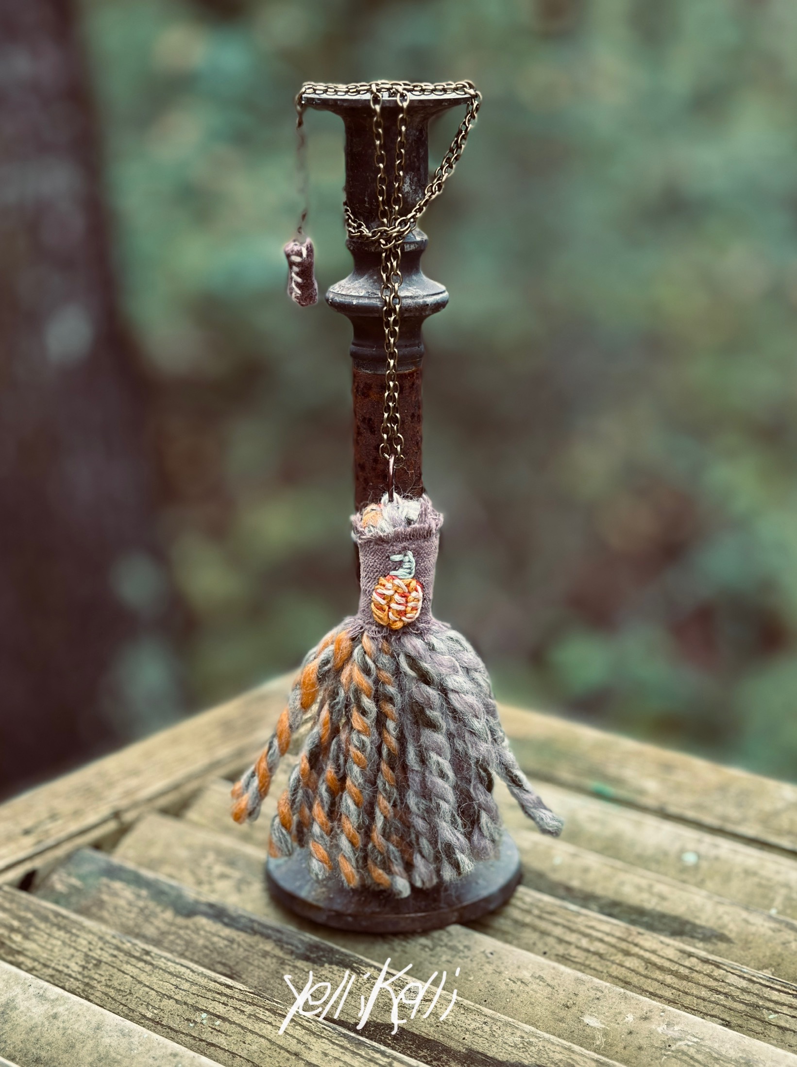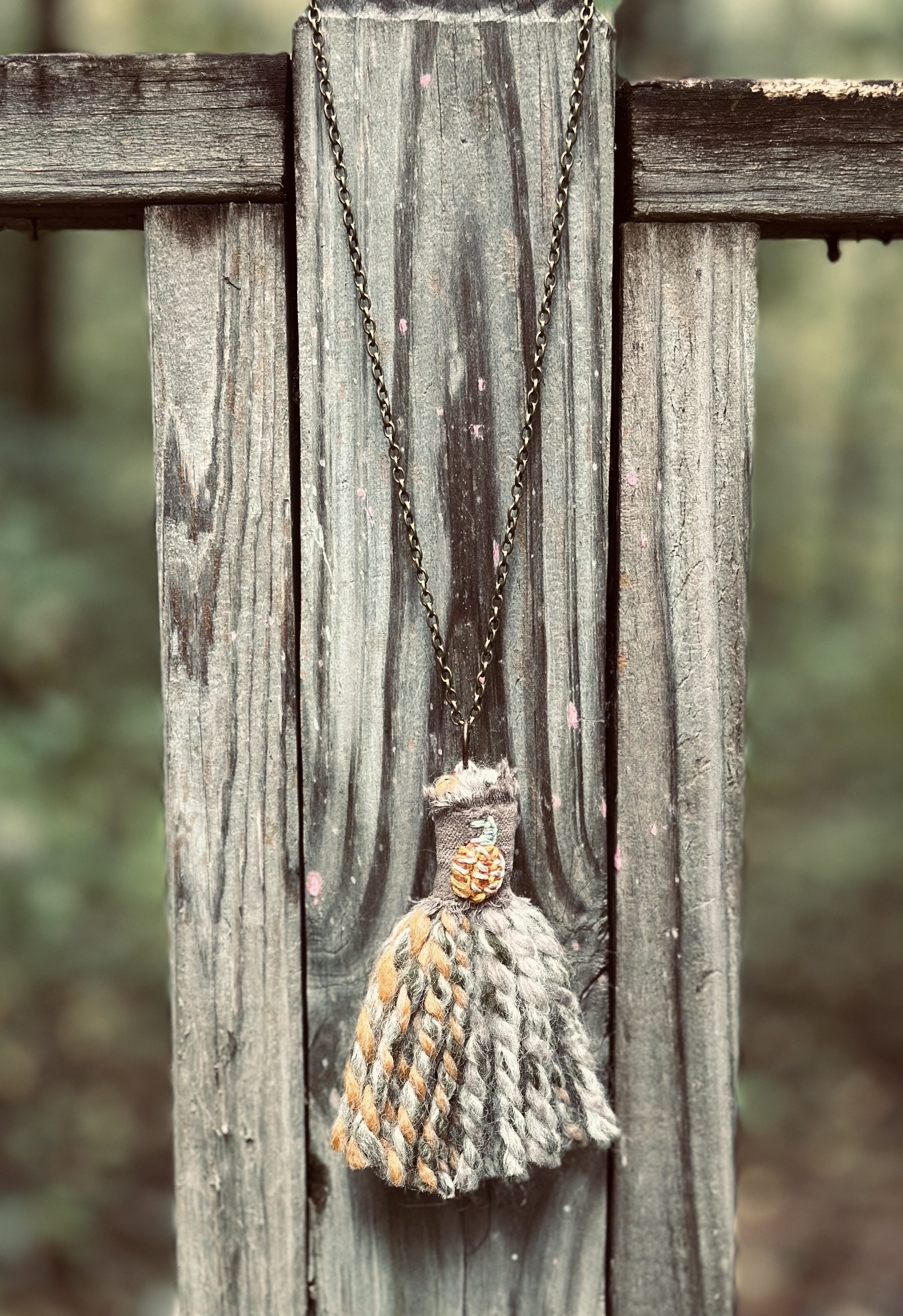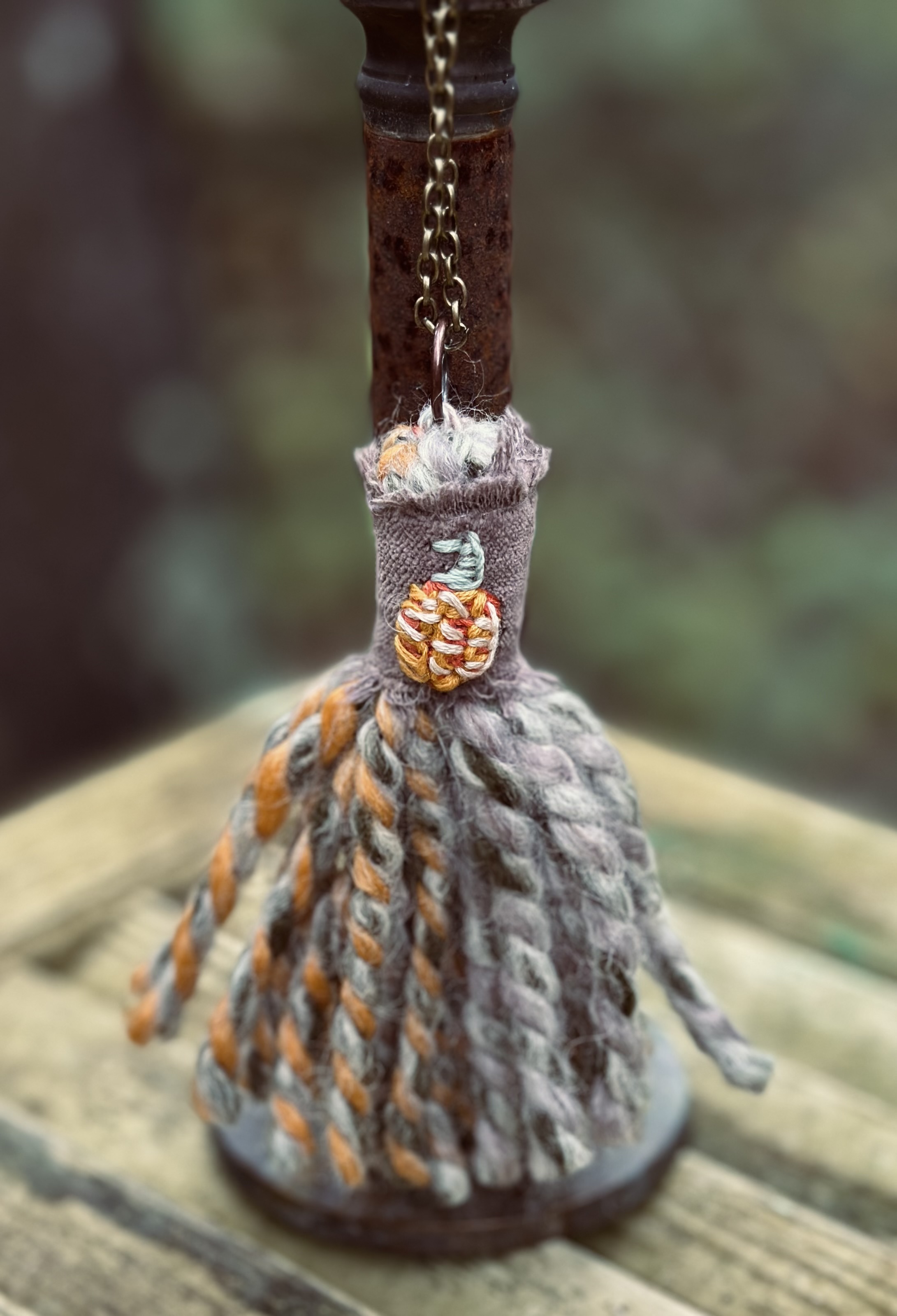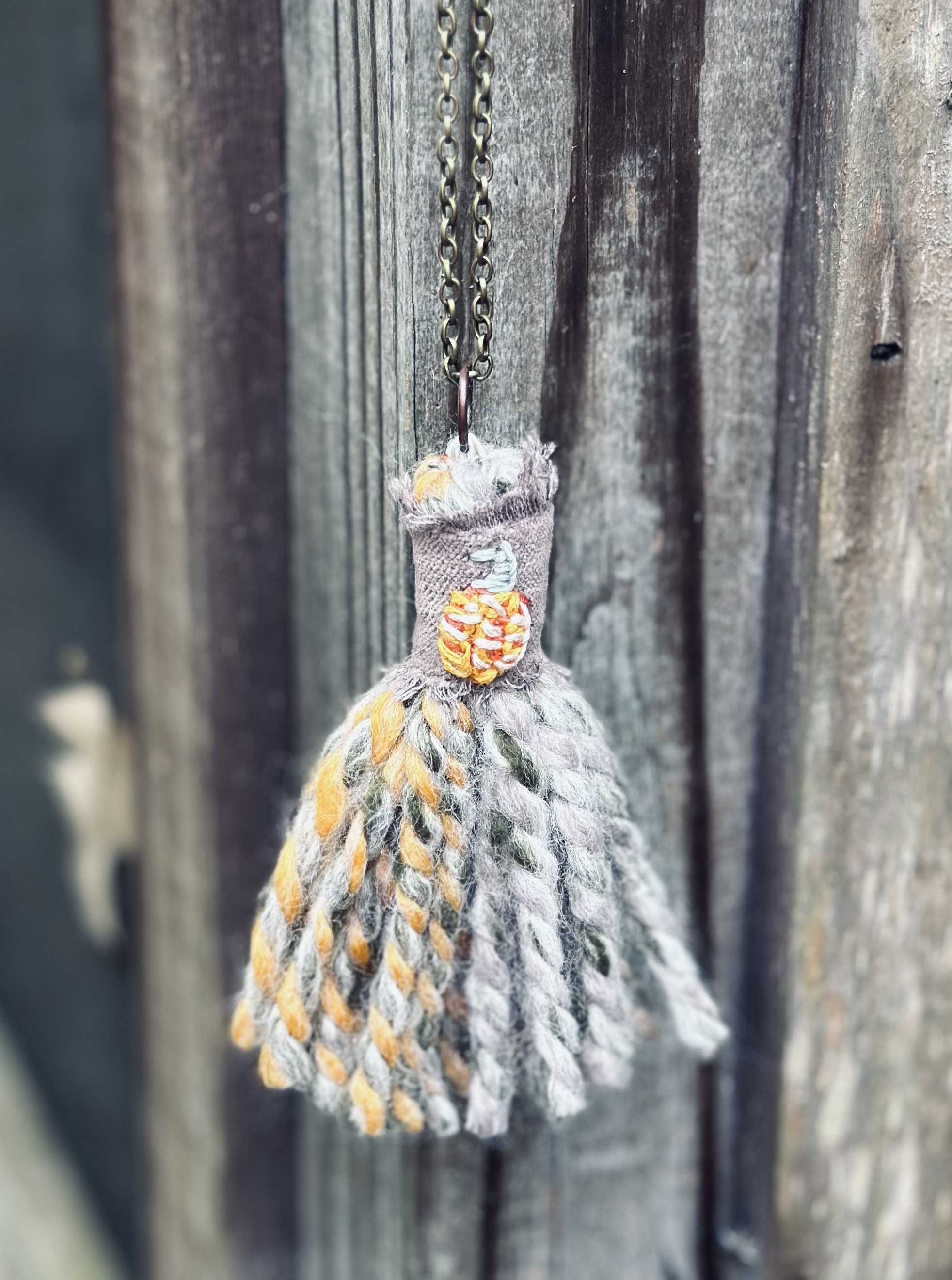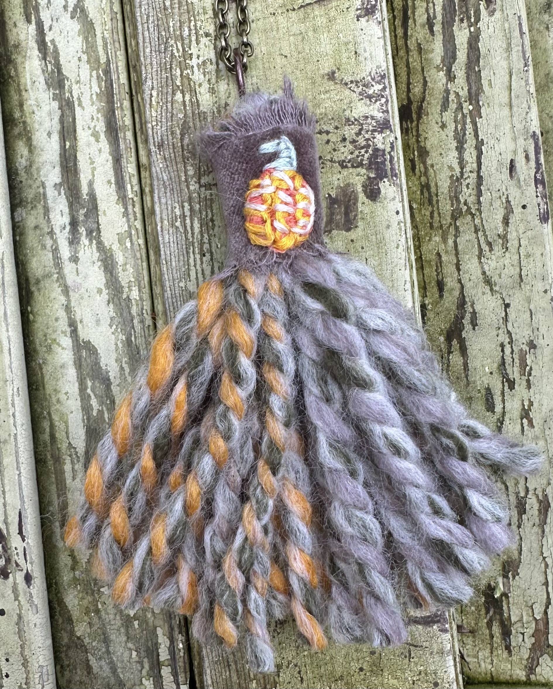 This Wool and Velvet tassel pendant has a hand embroidered pumpkin, a brass chain, and funky fashion flair for fall!