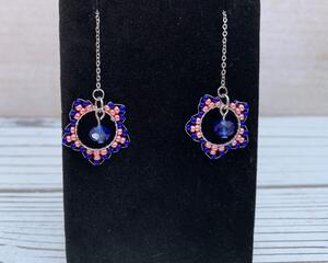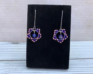 These beautiful and original design earrings are created by Bethany. 12mm hoops are hand beaded with glass seed beads. A delicate glass crystal bead hangs in the middle, and then finished with a stainless steal threader. Total length is about 5”. The stainless is durable and hypoallergenic. The beauty of these is truly difficult to capture in a photo. Try a pair - you will not be disappointed!