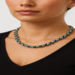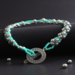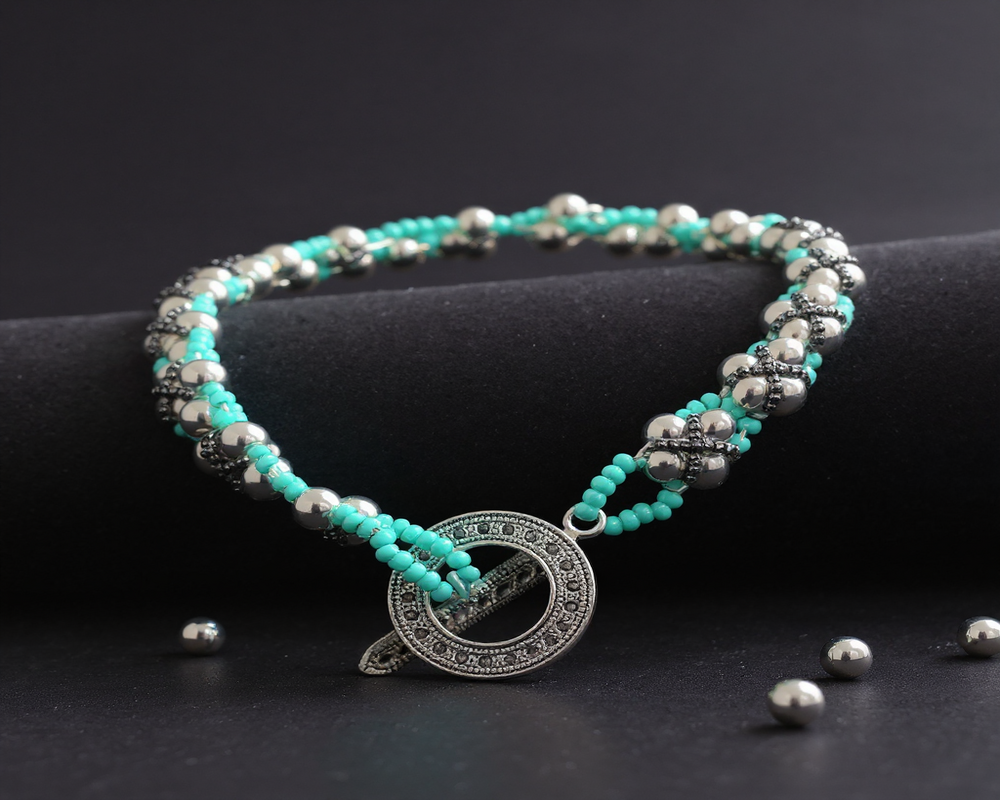 This is a heavier necklace with a sense of direction and discovery made with shimmering silver rounds, inky black beads, and vibrant turquoise seed beads that form a repeated X-shaped pattern throughout the strand. The design is finished with an ornate silver-tone toggle clasp, both secure and stylish. Whether you see it as treasure-map energy, geometric glam, or a confident visual punch — X Marks the Spot is made to be found.