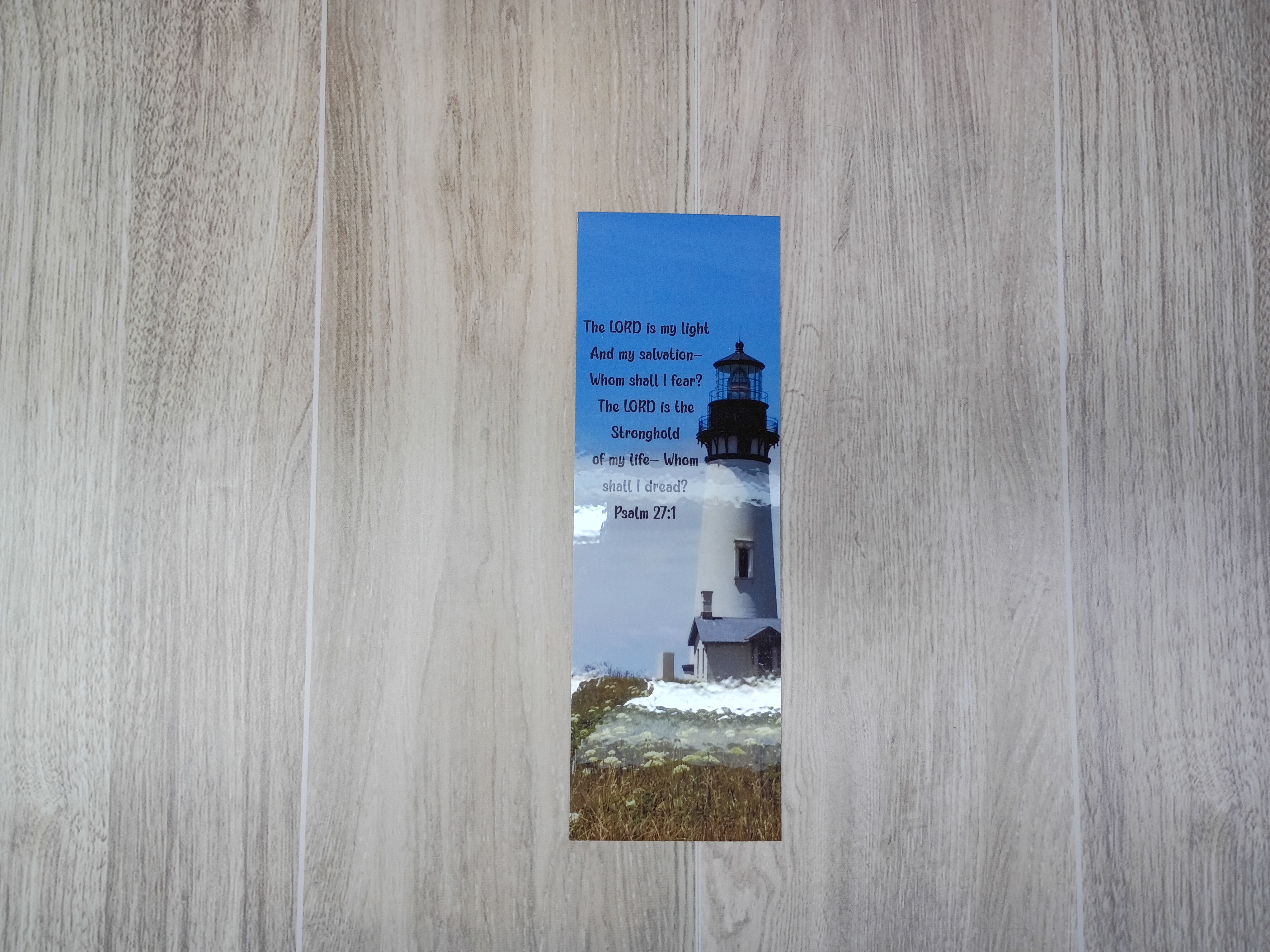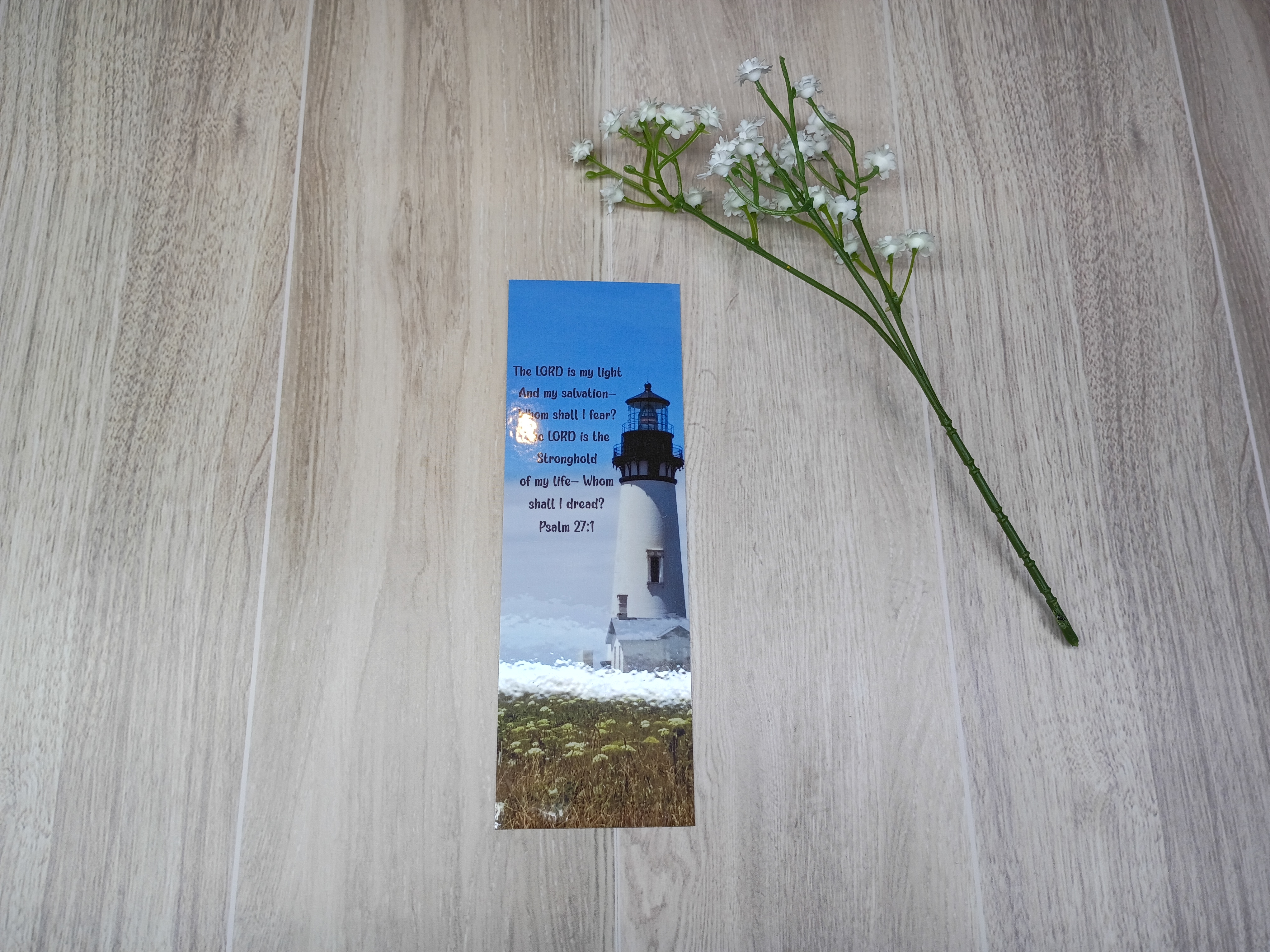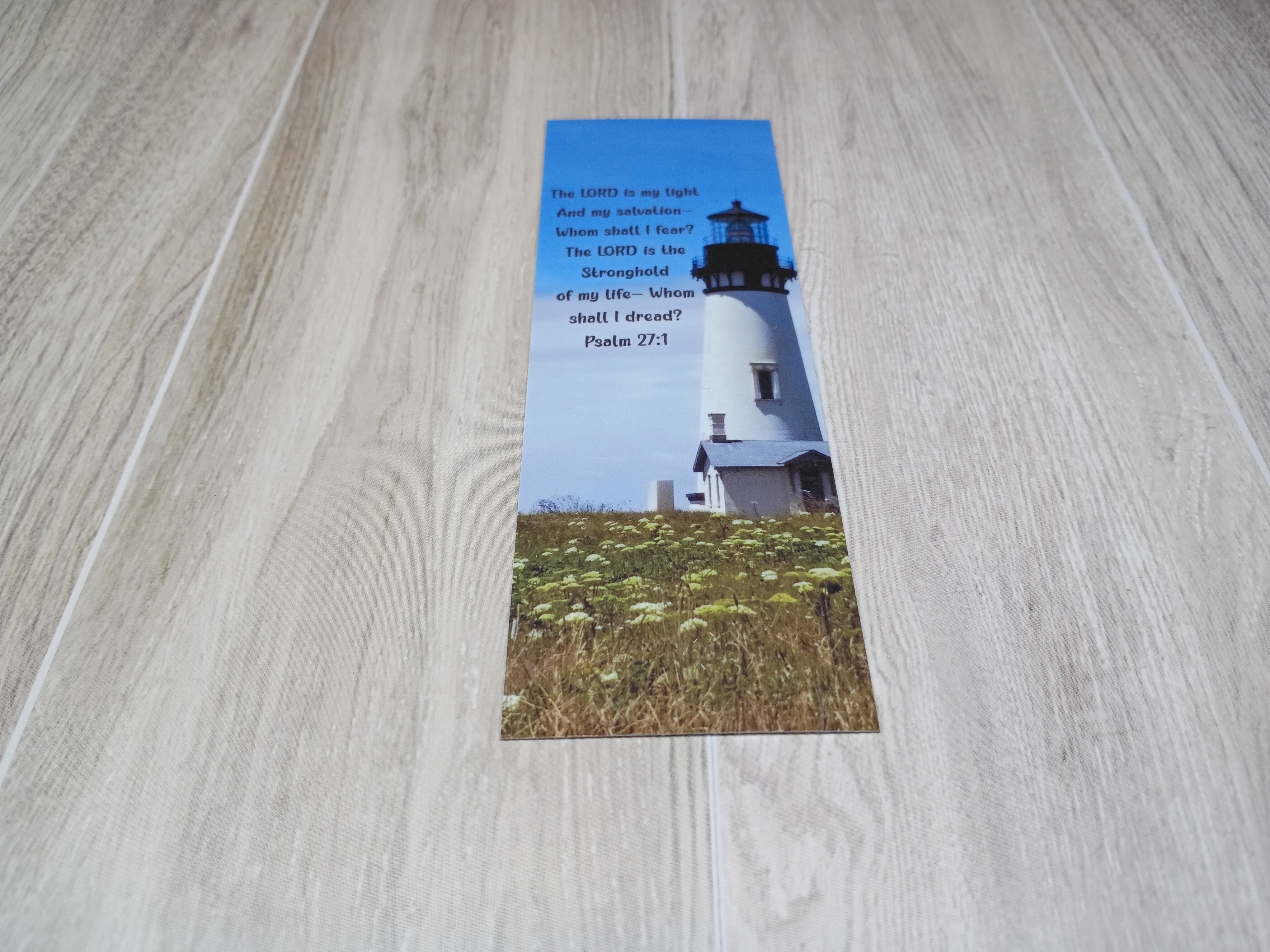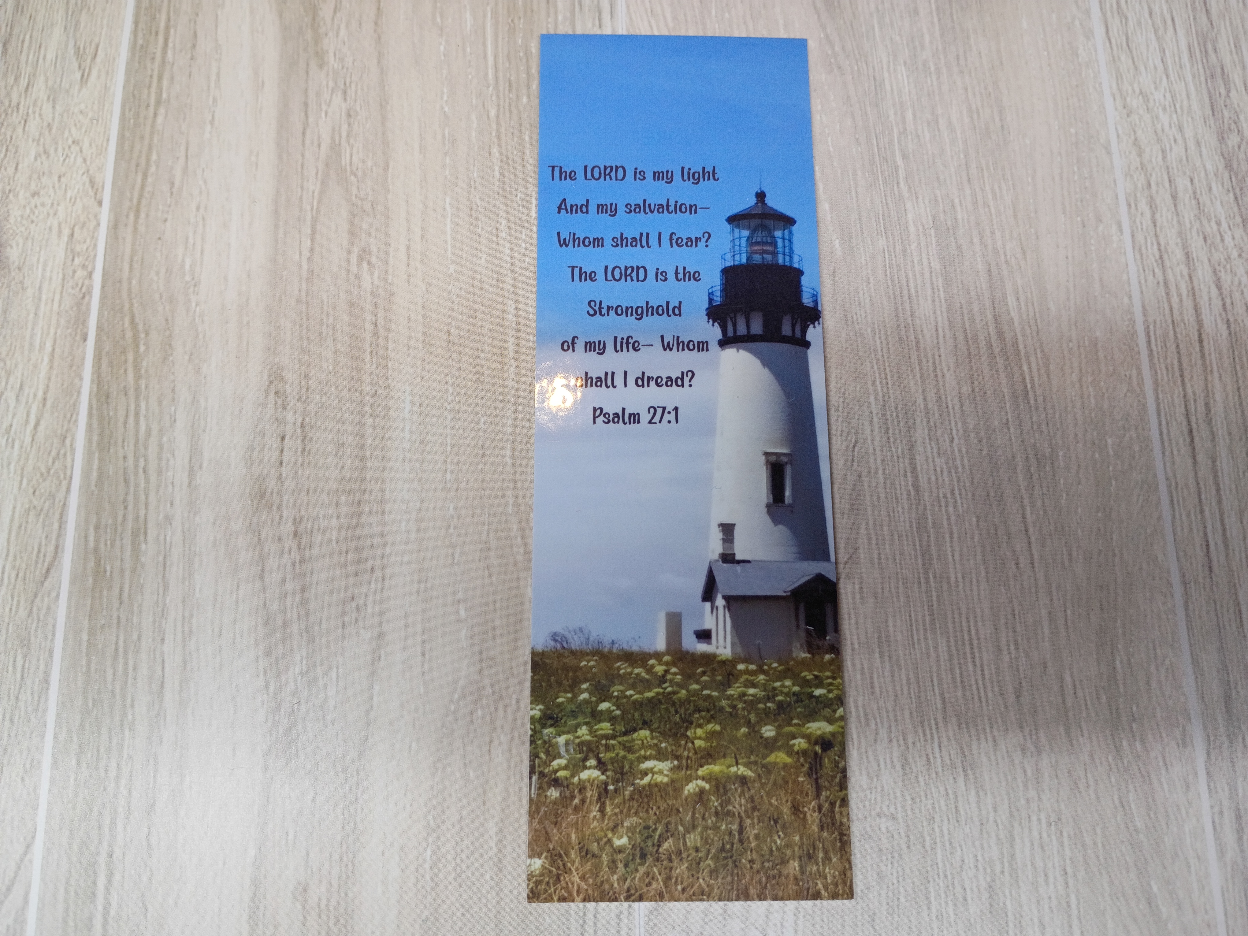 Carry inspiration with you wherever you read with this handmade Yakina Head Lighthouse Bookmark. Featuring original photography of the iconic Oregon lighthouse, this design is laminated on both sides for durability and a smooth finish. The front includes the verse Psalm 27:1: “The Lord is my light and my salvation--Whom shall I fear? The LORD is the Stronghold of my life--Whom shall I dread?" offering a meaningful reminder of faith and strength. The back is left blank for a clean, simple look.