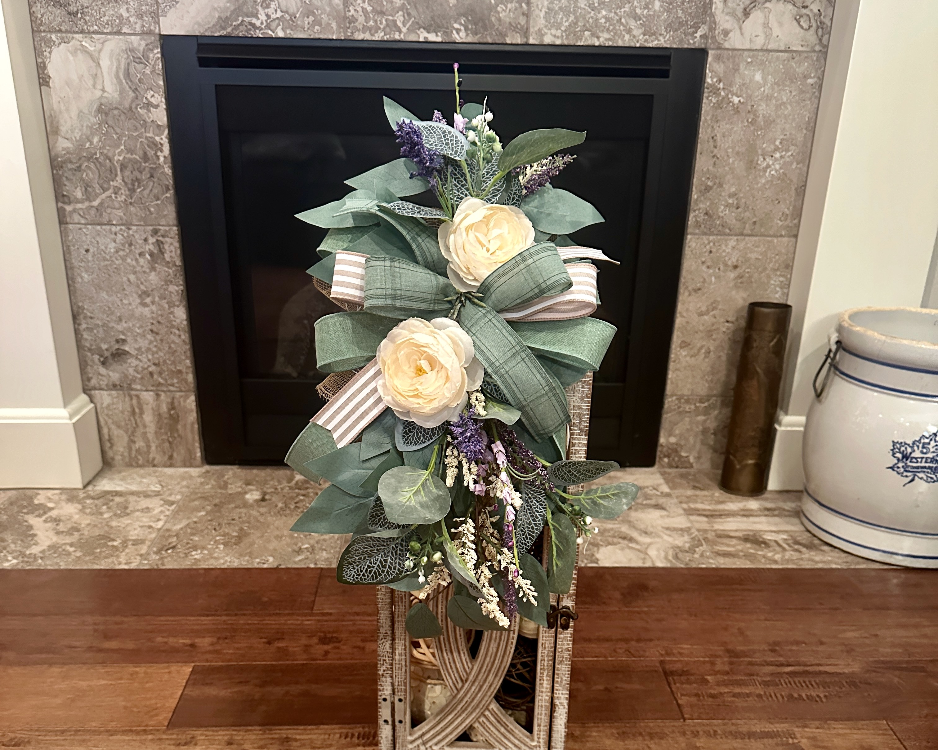 ~ Shown here in photos on a tall wooden lantern that is 24"x6"x6" (LANTERN NOT INCLUDED). This swag will be a lovely fit for 20"-30" tall lanterns, depending on your personal preference for length of florals cascading down the lantern.