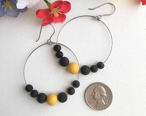 Bring a pop of spring to your ears! These Teardrop/Oval Dangle Earrings have a matte bright yellow glass bead surrounded by 6 black lava beads that are ready to absorb your favorite essential oils. Those black beads really make the yellow stand out! Simple, lightweight, and with a pop of bright yellow happiness. Made with stainless steel wire.
