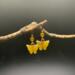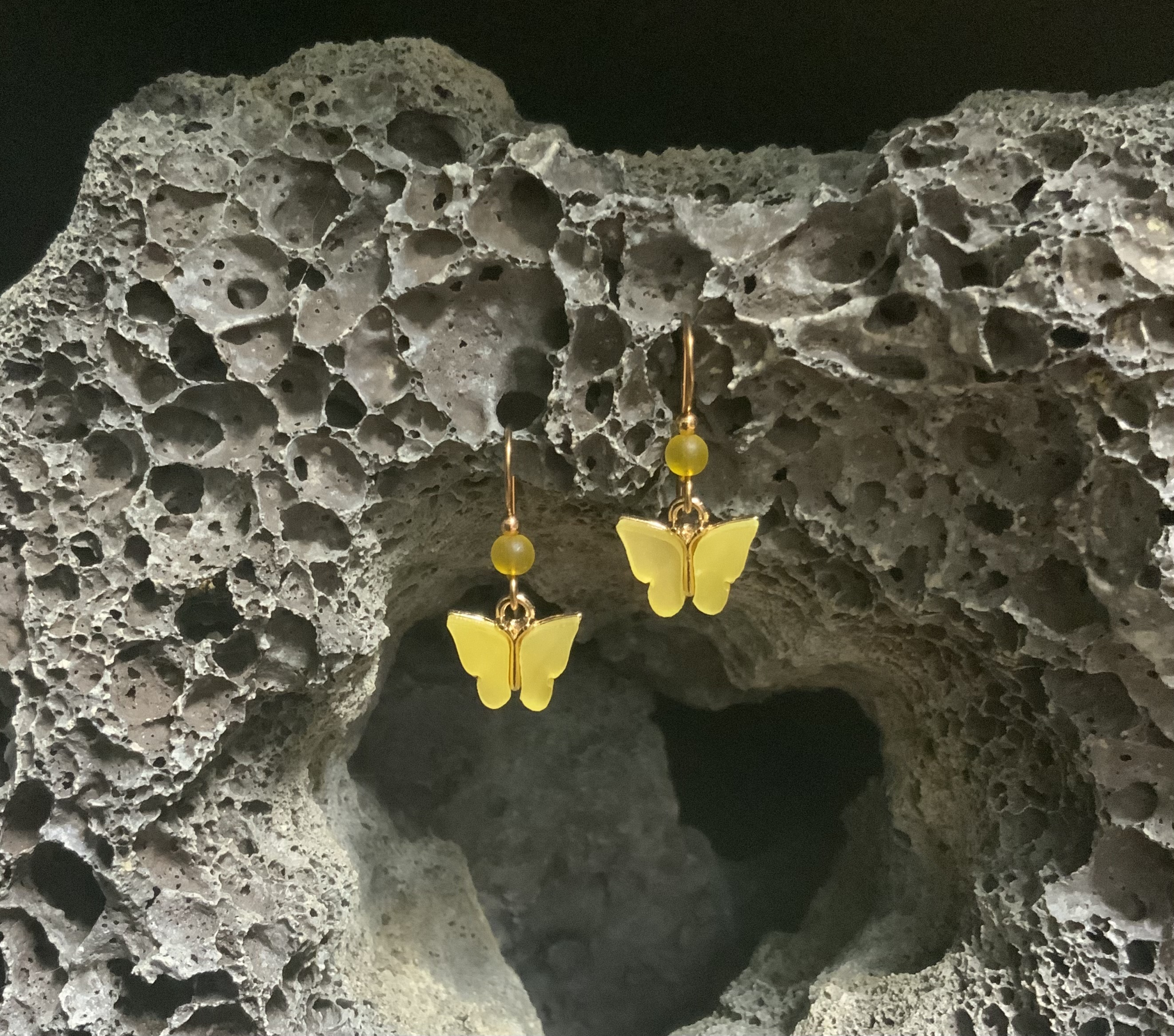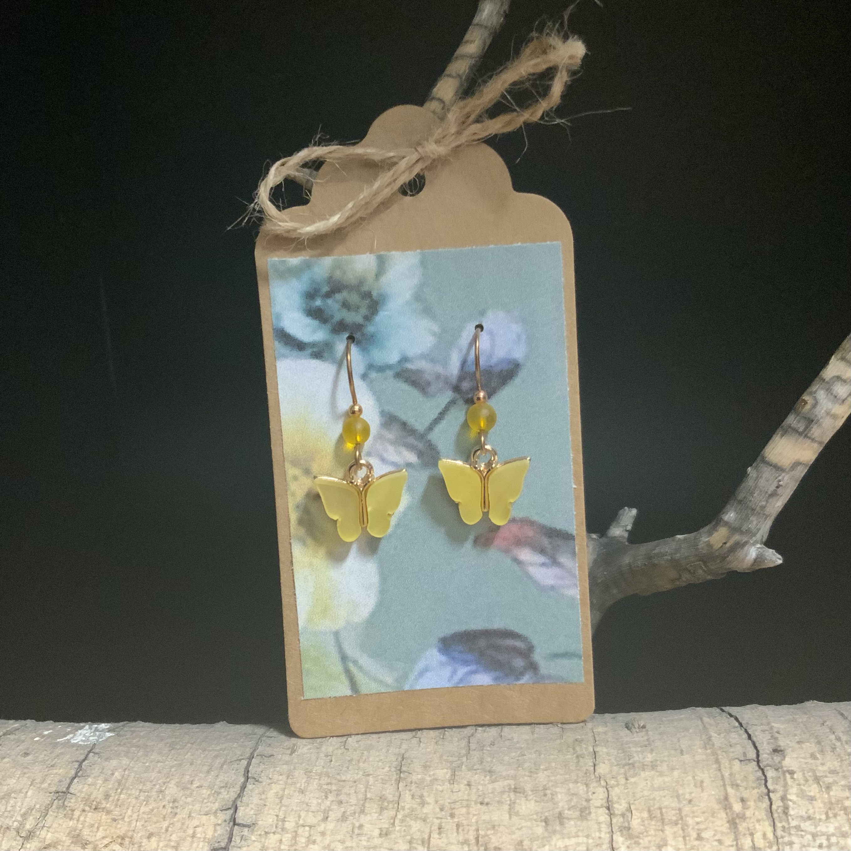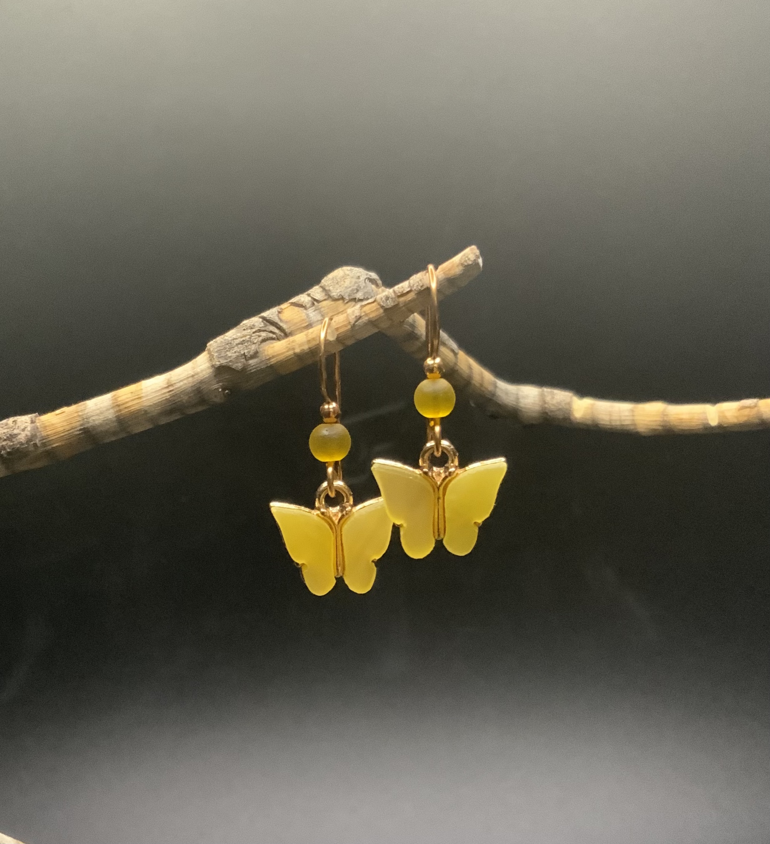 These butterfly earrings have handmade bronze ear wires with a 4mm yellow beach-style glass beads. The yellow butterfly wings are acrylic inclosed in plated gold. These will be beautiful for those Spring and Summer days. Each pair of earrings comes displayed on a handmade card.
