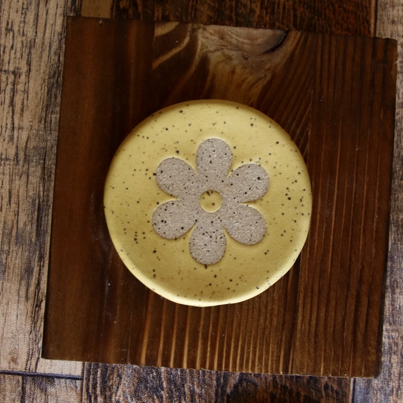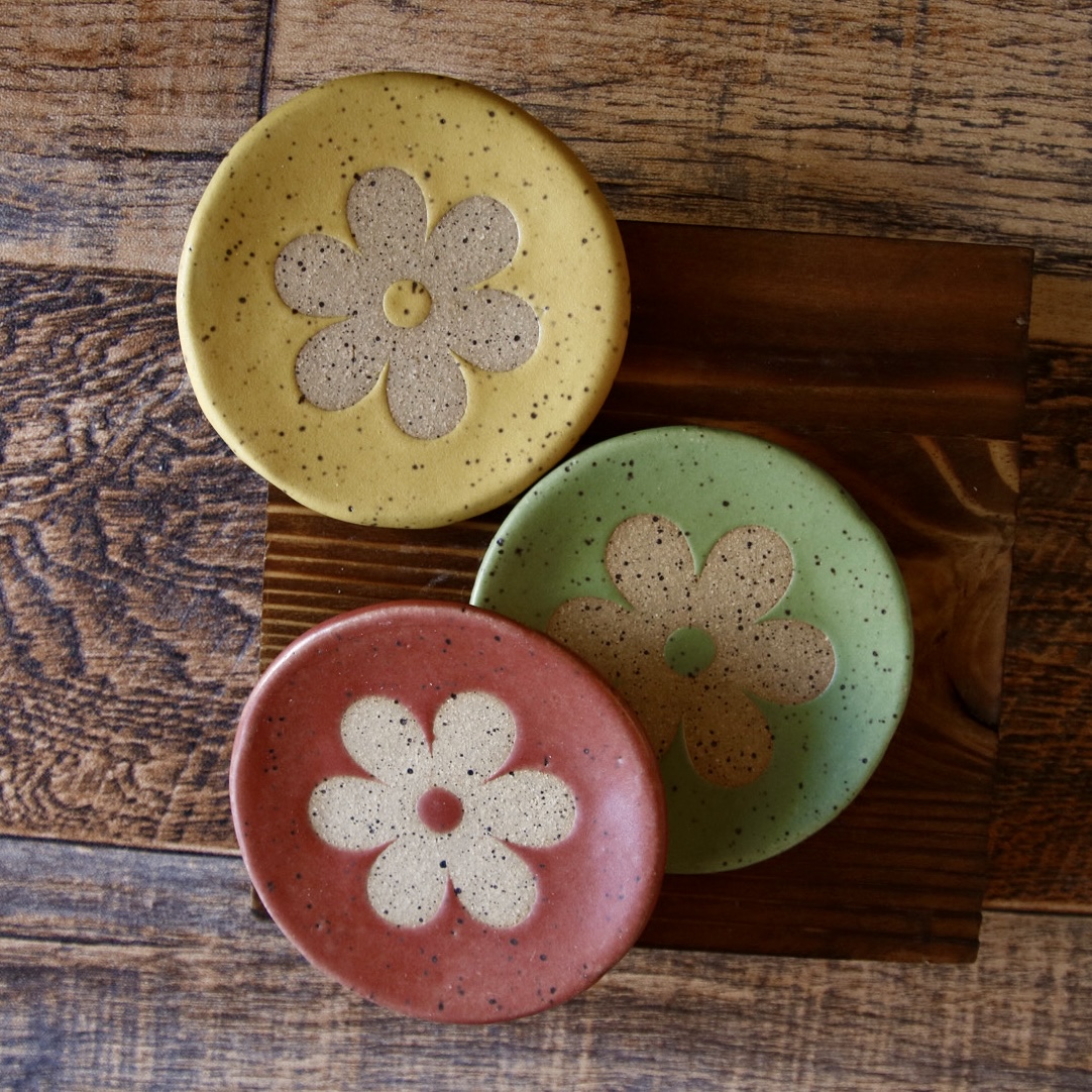 These sweet retro looking flower plates are perfect for use as trinket dishes, tea bag holders, or to hold your coffee spoon. They measure about 3 inches across. The glaze is satiny smooth, with the unglazed flower in brown contrast. It is microwave and dishwasher safe, and the unglazed portion is perfectly safe to rest a spoon. These match the Retro Green Flower Mug.