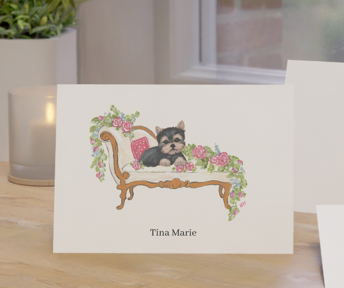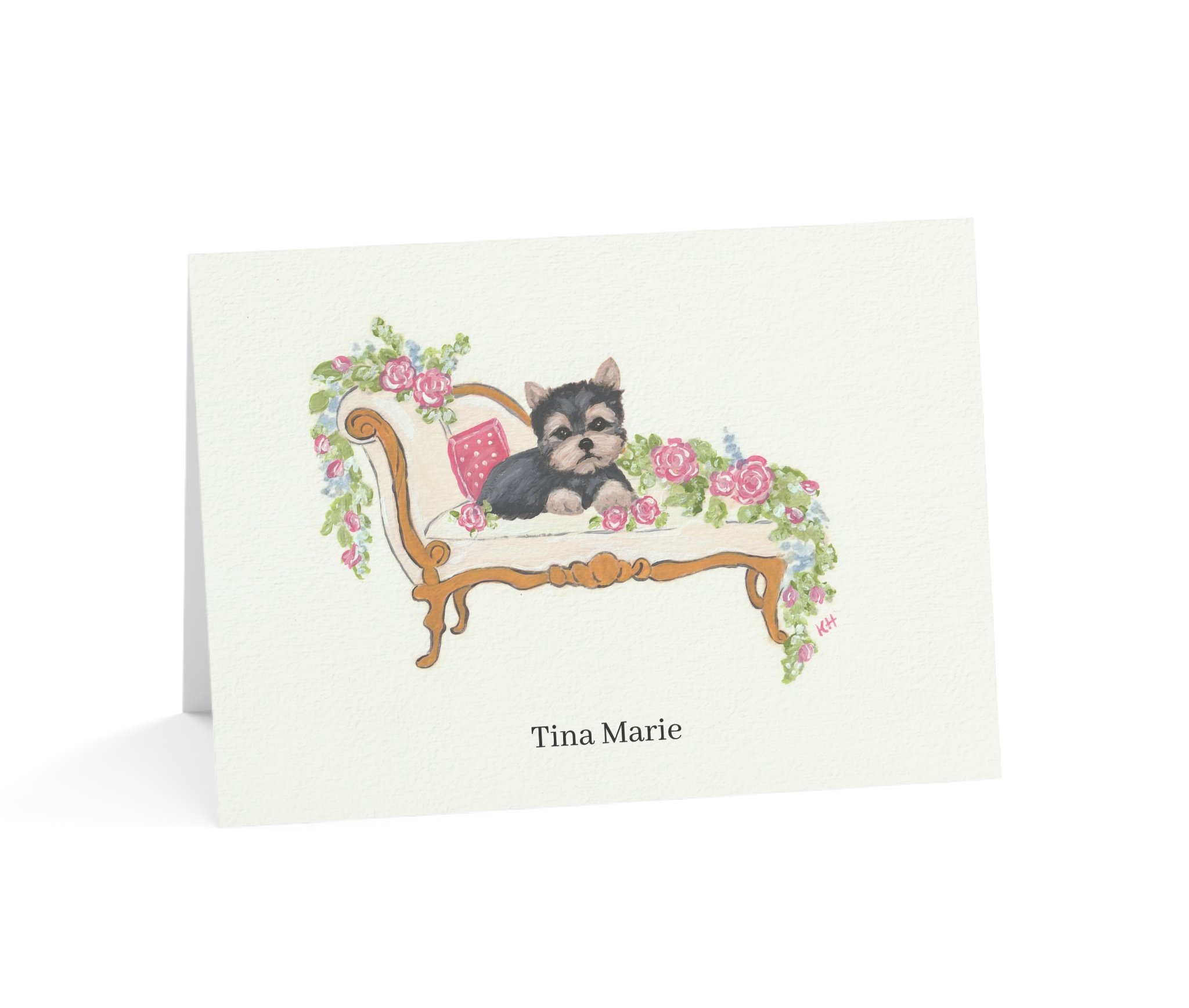 This adorable Yorkie puppy enjoying her chaise surrounded by pink roses! This set would be perfect for a new puppy owner, or any Yorkshire Terrier Lover!!