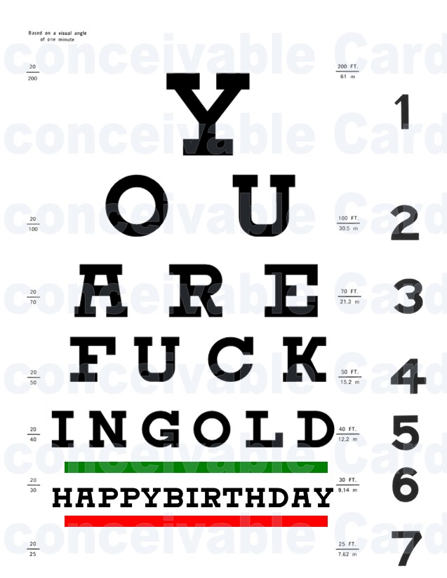 Finally, a birthday card that tells it exactly like it is — with the subtlety of an eye exam and the vocabulary of a sailor. This chart spells out what we’re all thinking: You are f*cking gold. Happy birthday. Time to get your eyes checked and feel amazing.