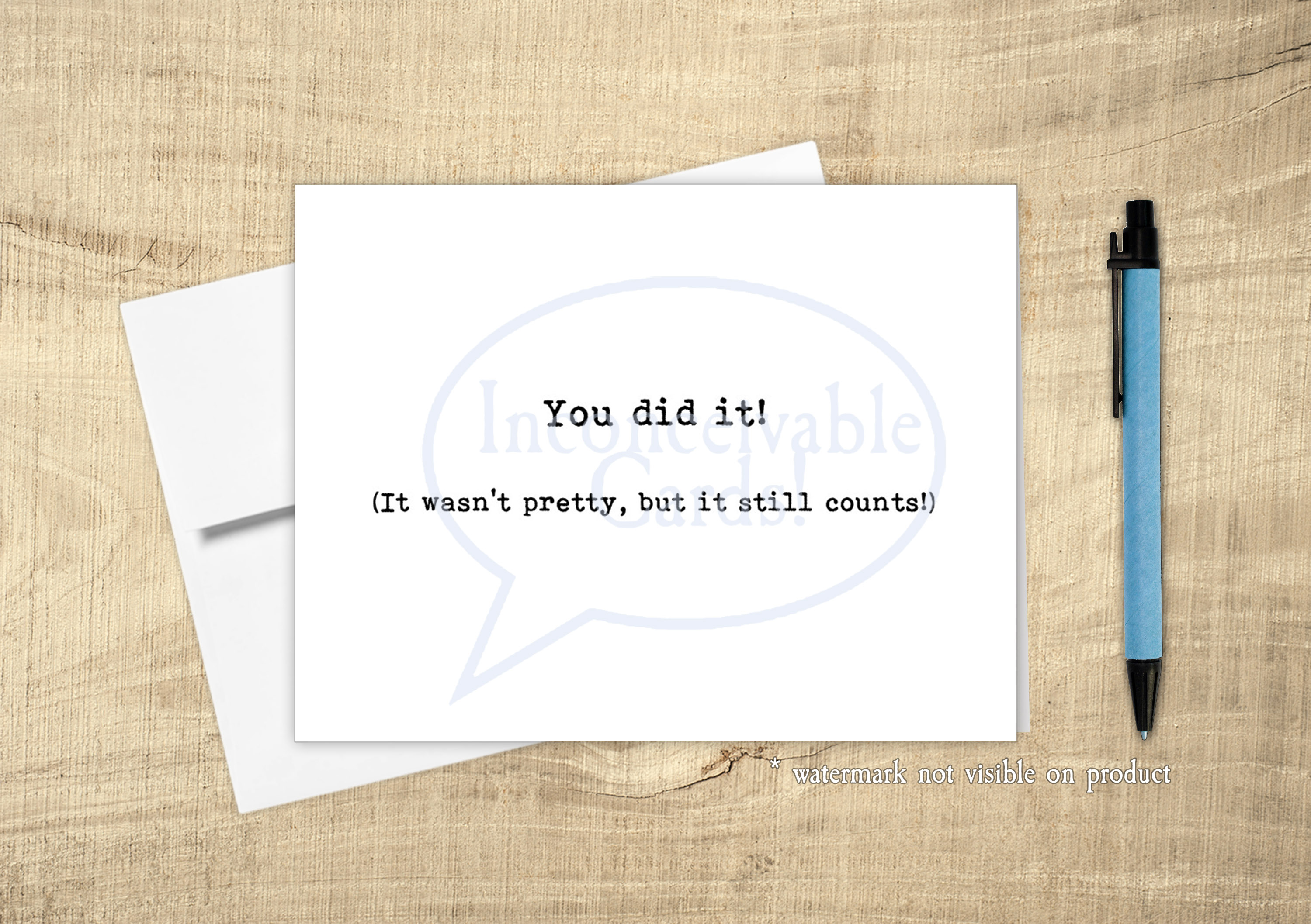 Success doesn’t have to be graceful to be valid. This deadpan congratulations card is perfect for graduations, promotions, big life changes, or simply surviving something difficult. Honest, encouraging, and just sarcastic enough, it celebrates progress without pretending the journey was Instagram-worthy.