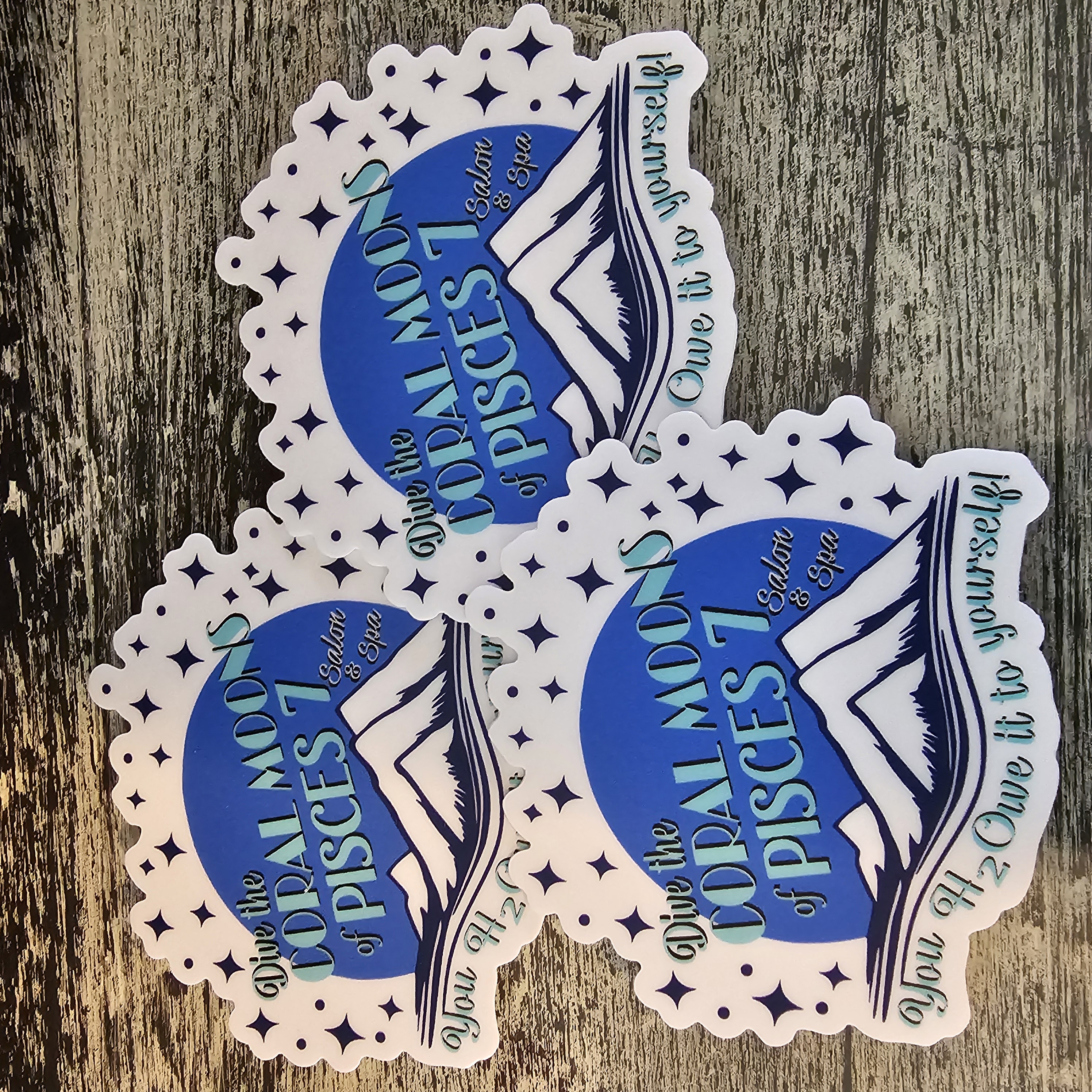 Set against a crisp white background, waves of blue shimmer as the coral moons glow in every shade of azure, inviting calm that’s truly out of this world.