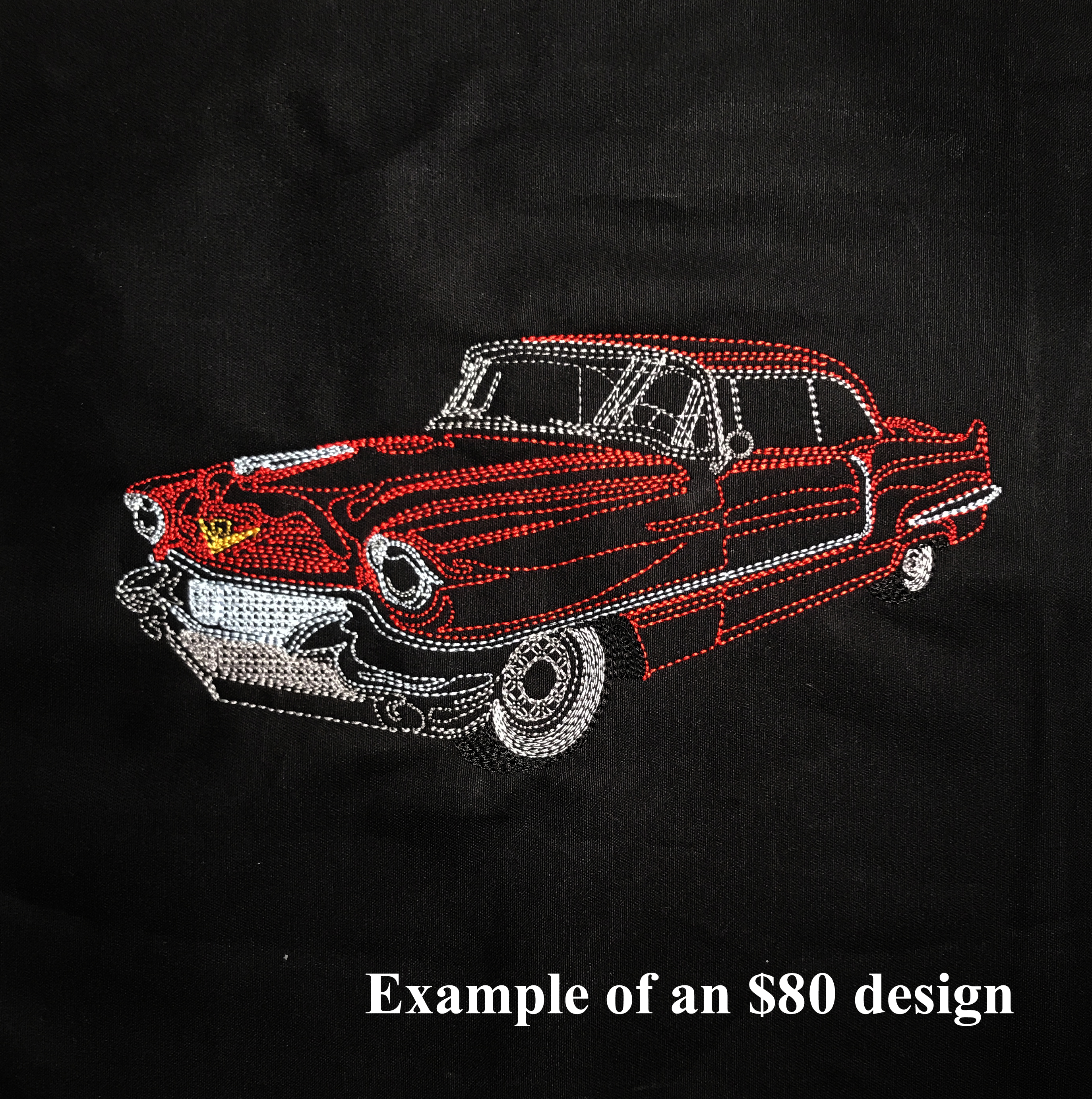 Your design created and embroidered on a black t-shirt.