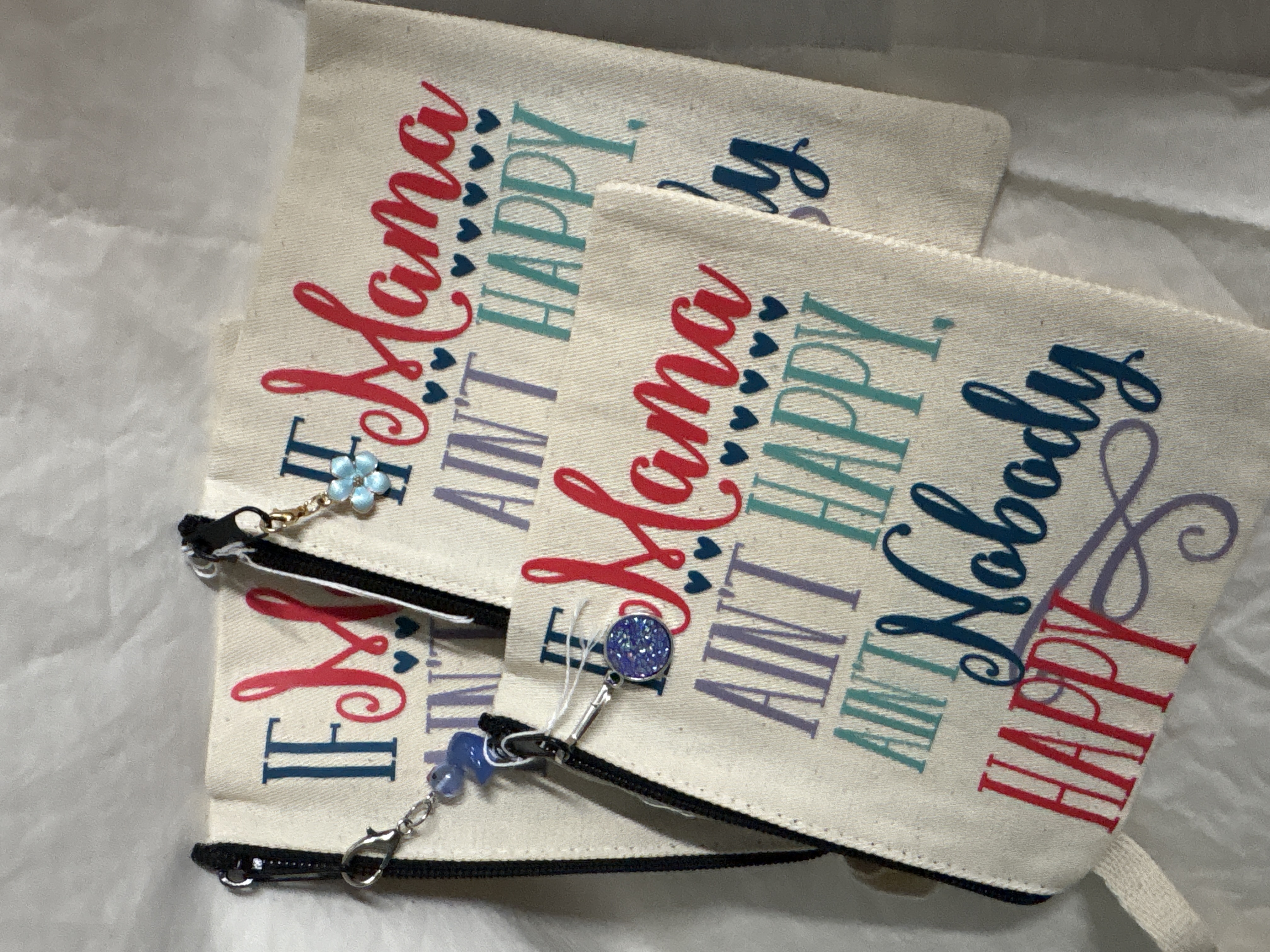This is a canvas zip up bag with a cute charm zipper pull. 4” x 5” in size