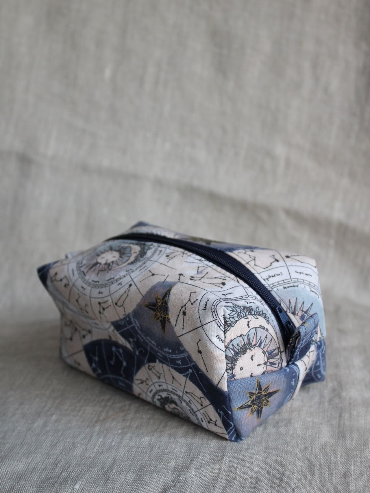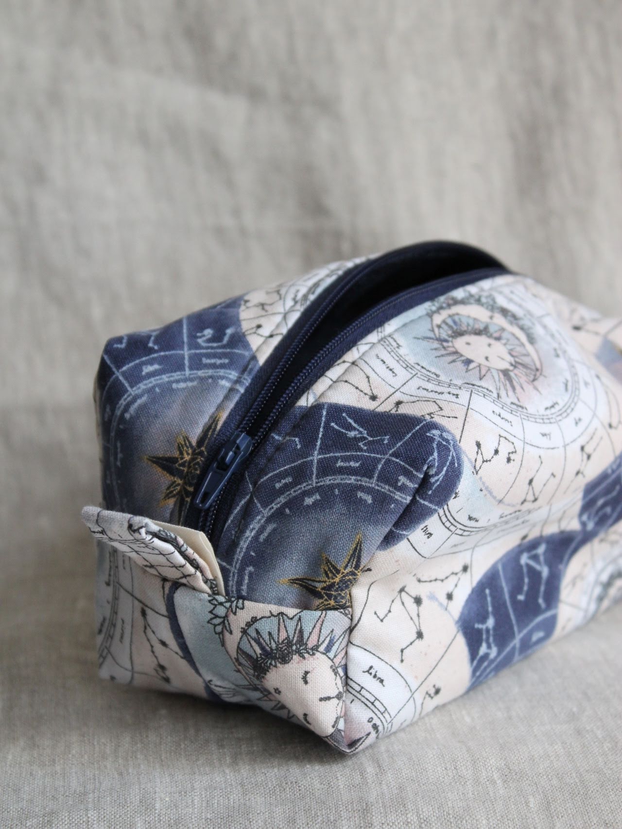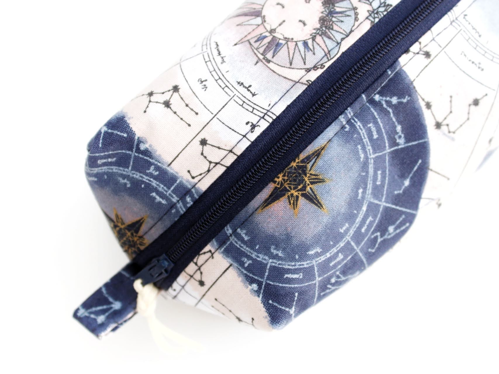 Handmade Zodiac "Boxy Babe" zipper bag featuring a celestial star chart zodiac design in deep navy, soft beige, and muted blue tones. The fabric is adorned with constellations, suns, and compass-style stars, giving it an elegant, cosmic vibe. Fully lined in a blue denim for durability, with a sturdy navy zipper and zipper pull, plus matching fabric loop handles for easy carrying. Perfect for storing makeup, toiletries, craft supplies, or travel essentials. Each bag is always crafted with care.