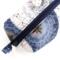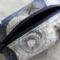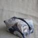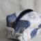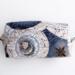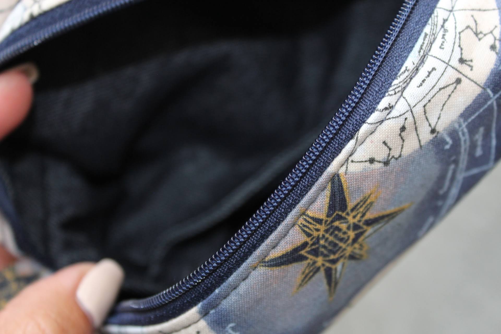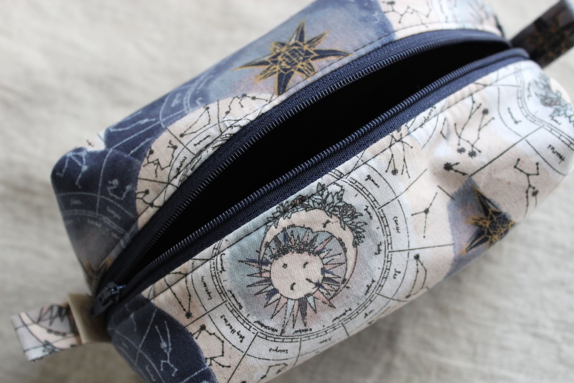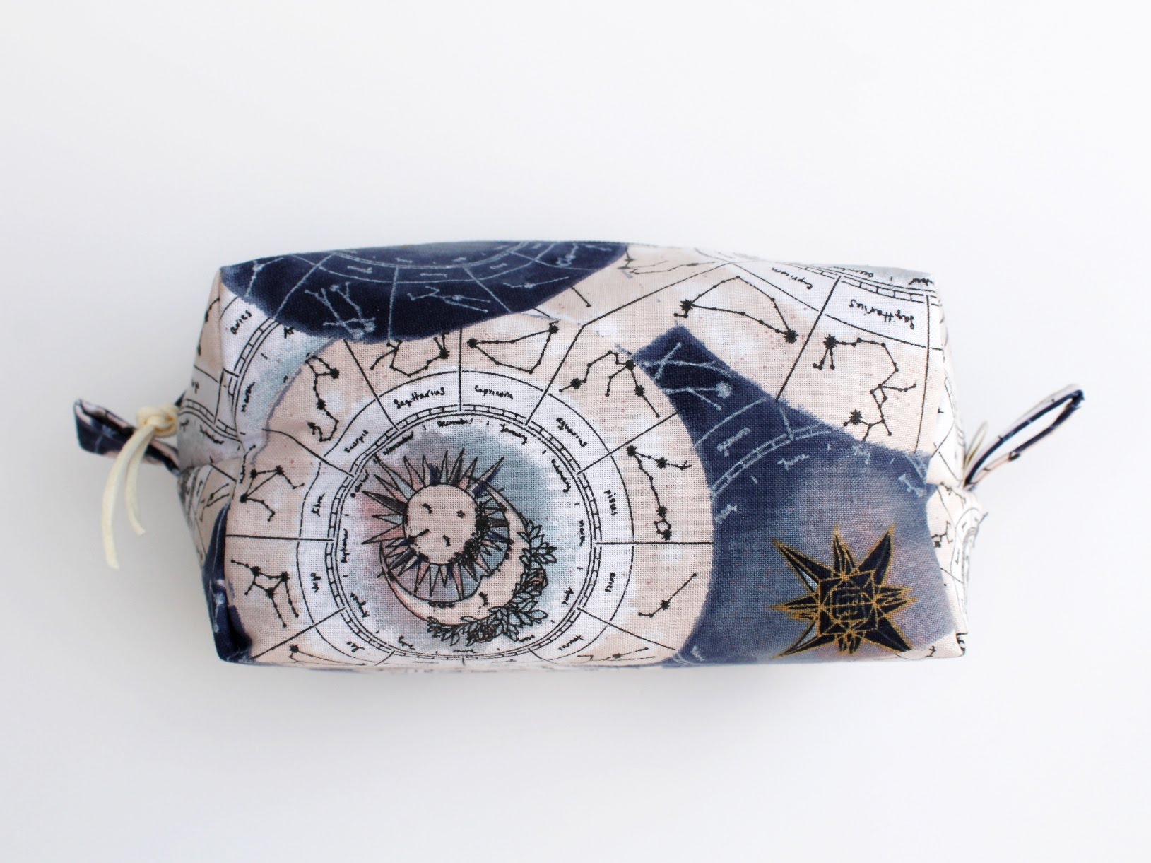 Handmade Zodiac "Boxy Babe" zipper bag featuring a celestial star chart zodiac design in deep navy, soft beige, and muted blue tones. The fabric is adorned with constellations, suns, and compass-style stars, giving it an elegant, cosmic vibe. Fully lined in a blue denim for durability, with a sturdy navy zipper and zipper pull, plus matching fabric loop handles for easy carrying. Perfect for storing makeup, toiletries, craft supplies, or travel essentials. Each bag is always crafted with care.
