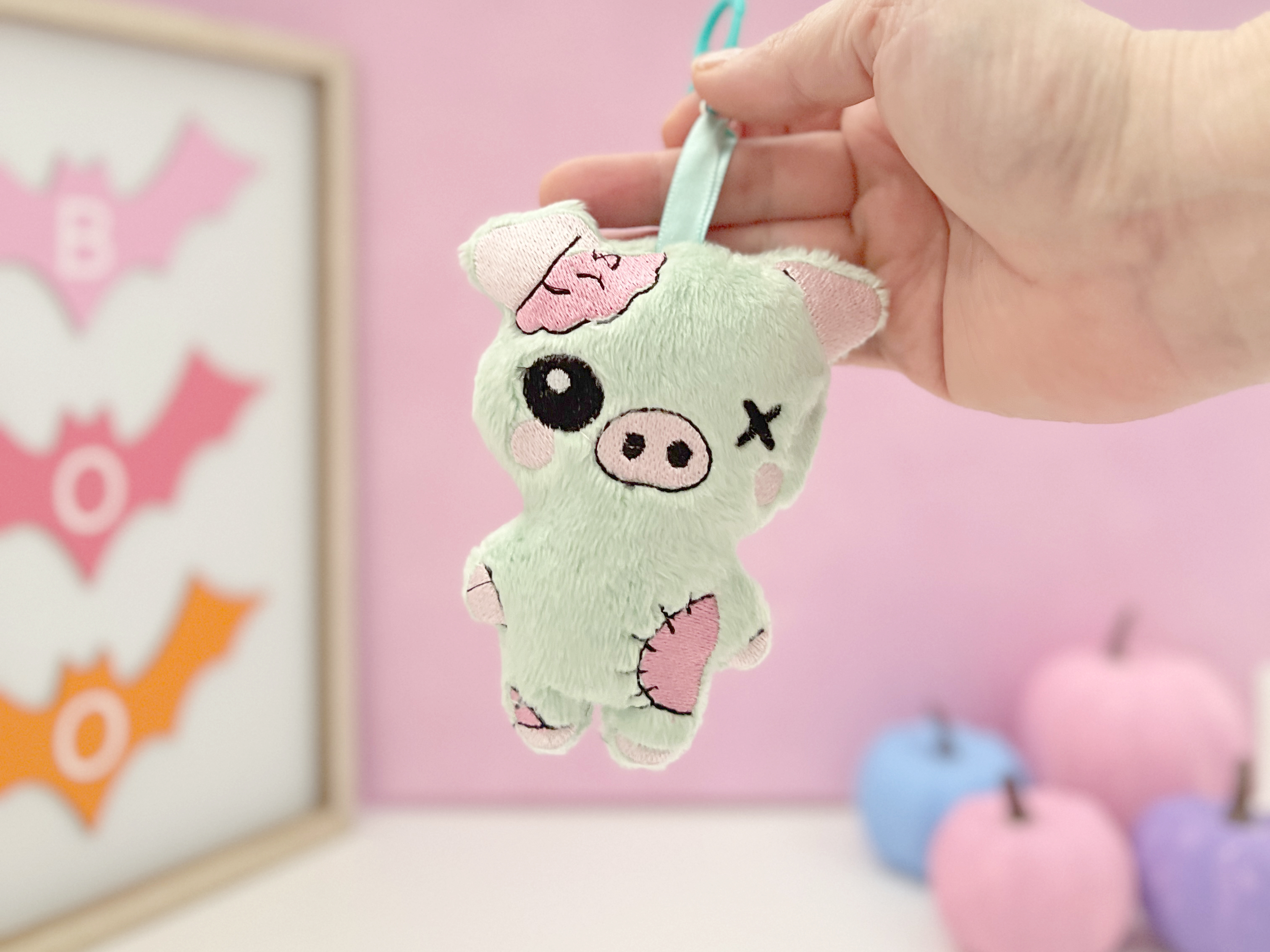 Oink your way into spooky style with this adorably undead Zombie Pig Plush Bag Charm! Handmade from soft pastel mint minky fabric, this creepy cute piggy features embroidered zombie details including pink exposed brains, black stitches, and a sweet kawaii undead face. The charm is finished with a sturdy plastic clasp, perfect for clipping to your purse, backpack, tote bag, or keys.